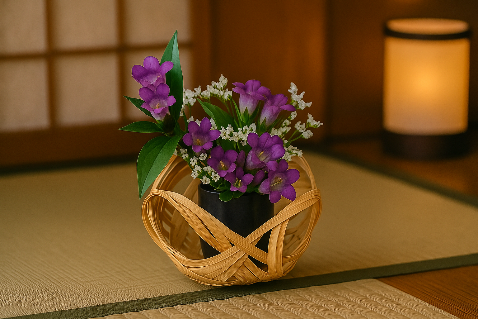 ころんとした両手のひらサイズの竹籠で、古くから花籠として用いられてきました。