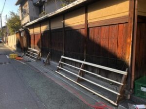こちらの犬矢来は、住宅の壁とくっついているタイプだったので、すべて現場で製作致しました。