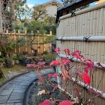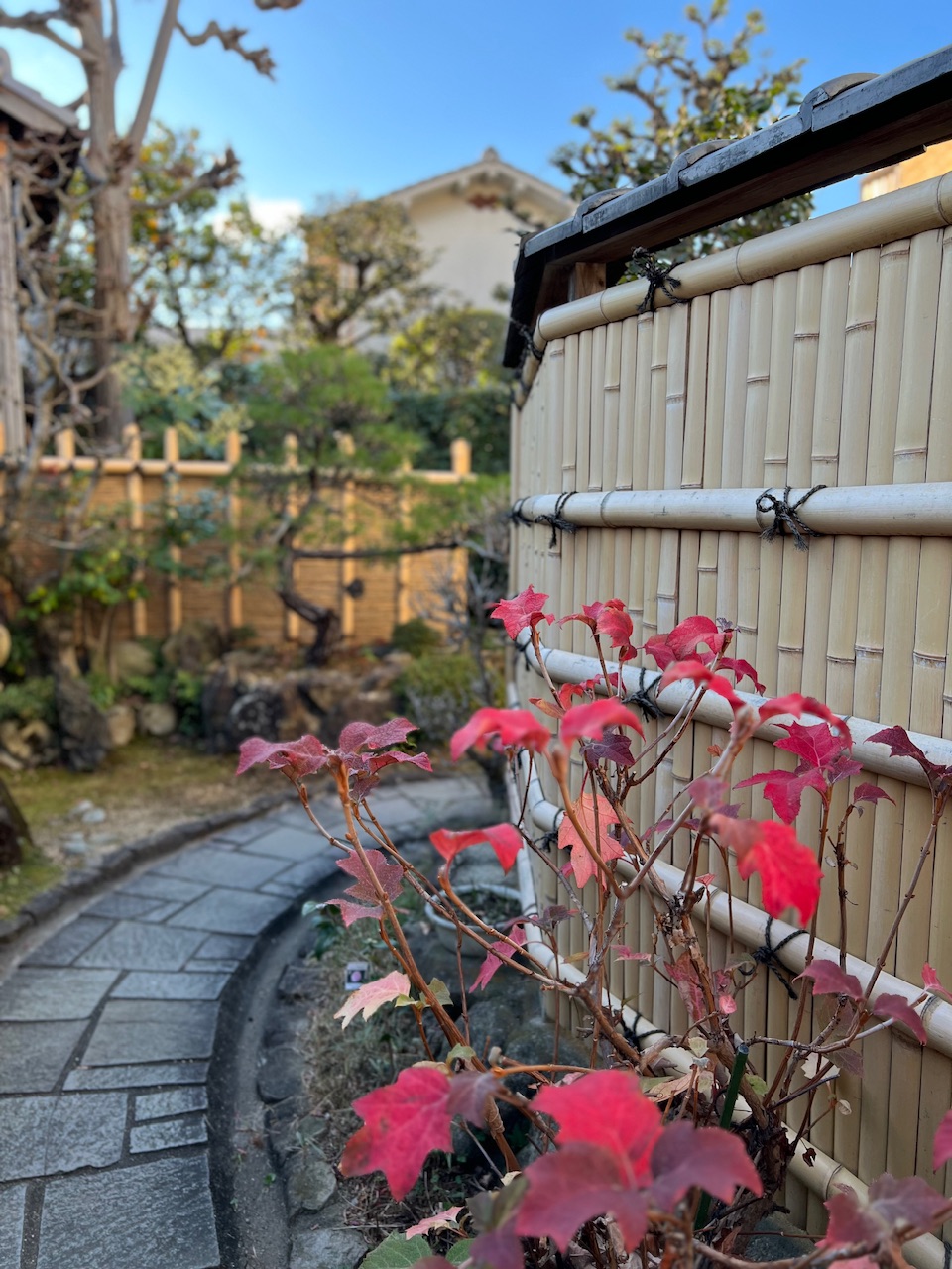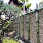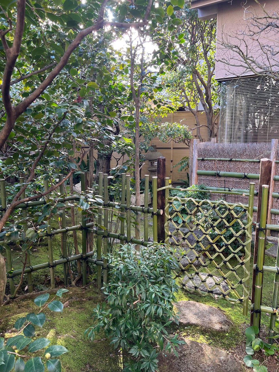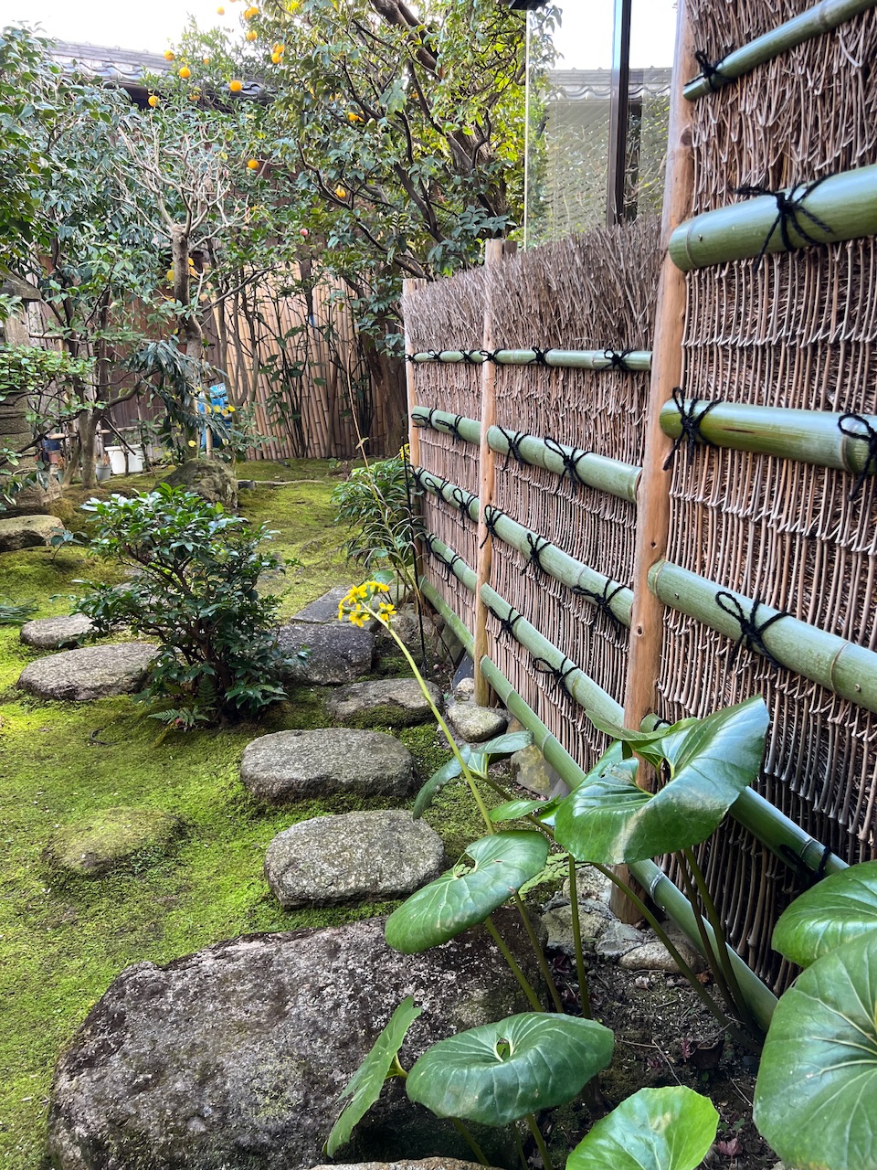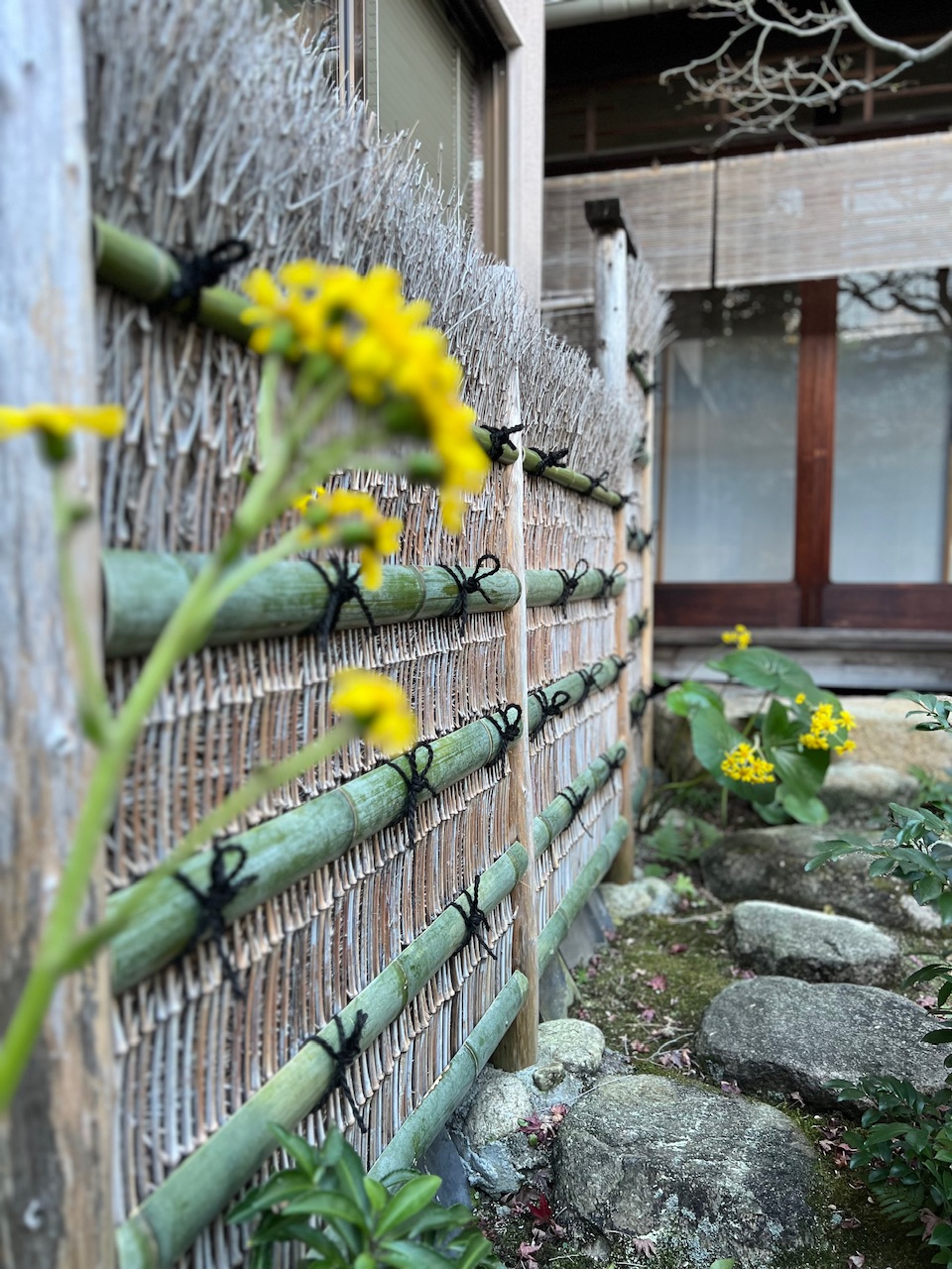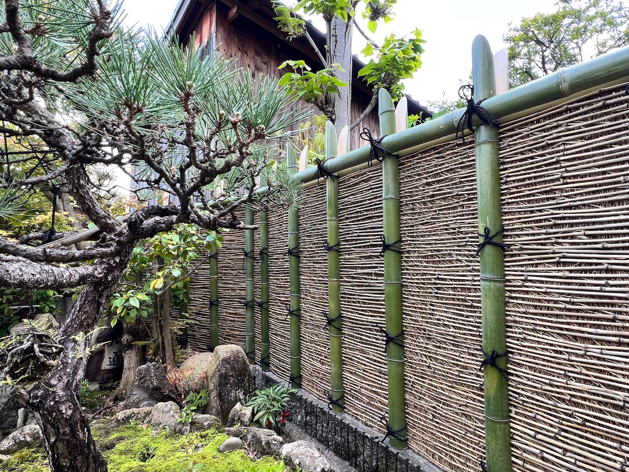 こちらのお庭には、建仁寺垣・竹枝穂垣・竹枝離宮書・四つ目垣・枝折り戸・筧・萩の袖垣・杉皮の屋根・矢竹の扉などたくさんの竹垣がございます。