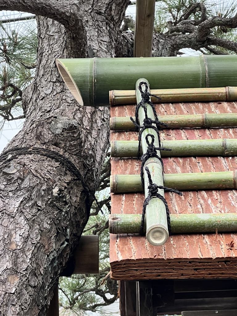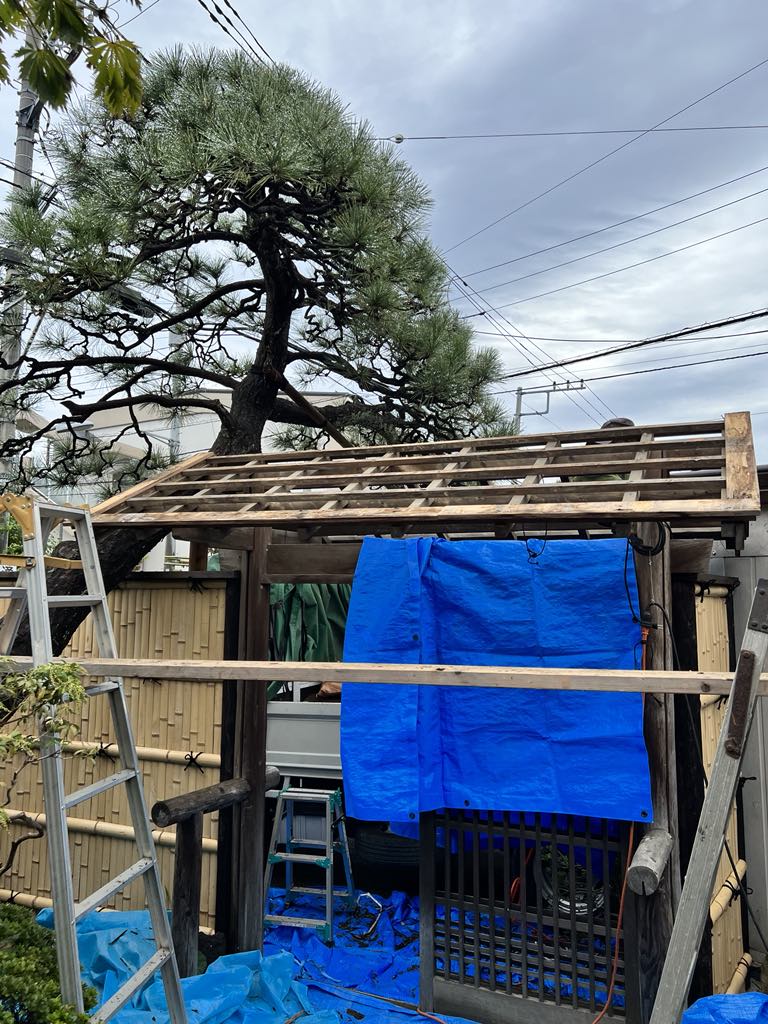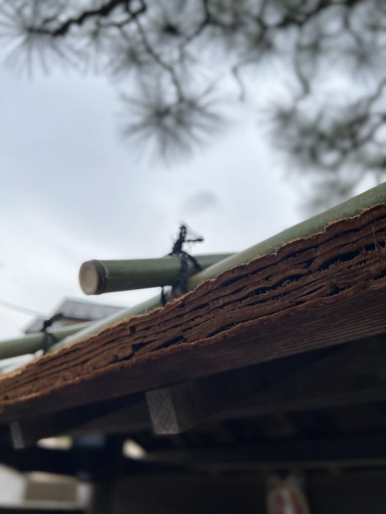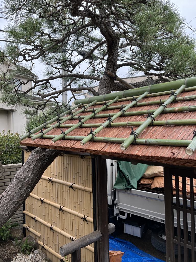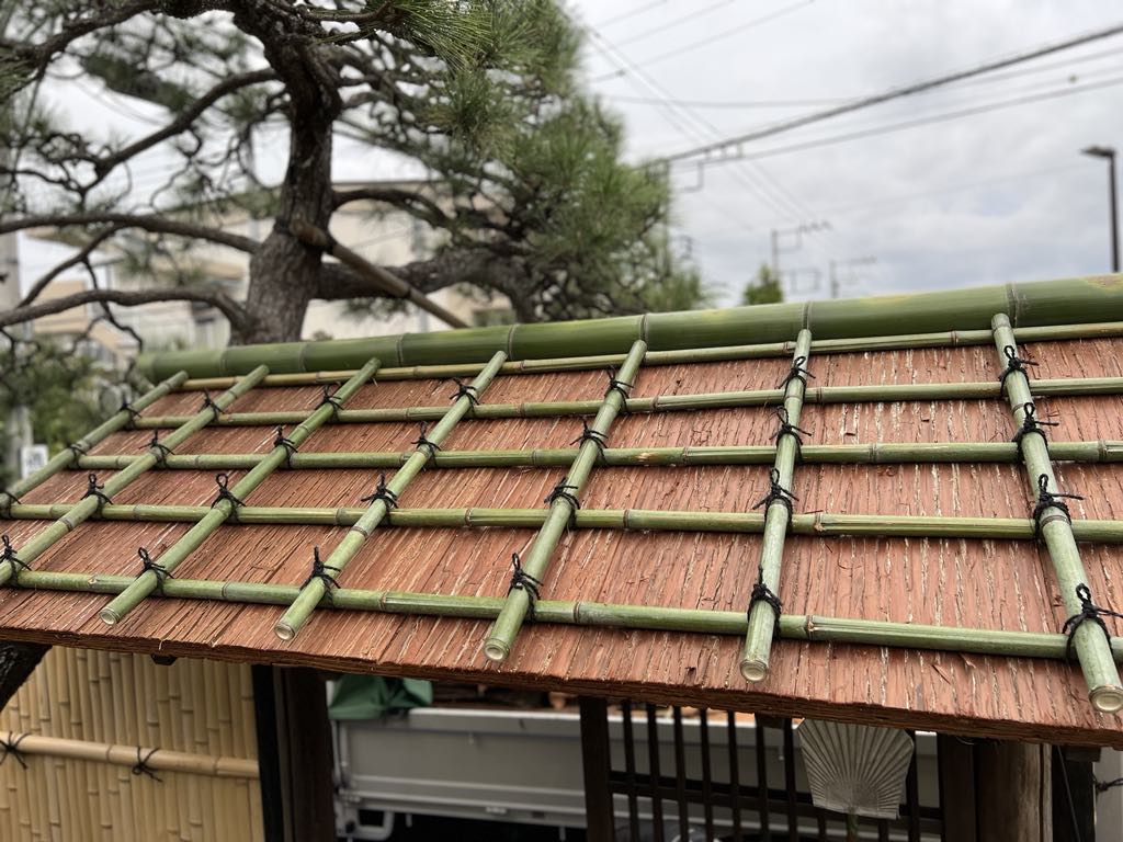 工事を終えて京都にお戻りになる際、竹がご専門のため屋根の葺き替えなど施工されないと思っていましたが、この機会に聞くだけでもと考えご相談をしましたところ、気持ちよくお引き受けいただきました。その後、杉皮の種類や特性など細かな打ち合わせをしていただき、竹垣に続いて屋根の葺き替え工事を終えました。