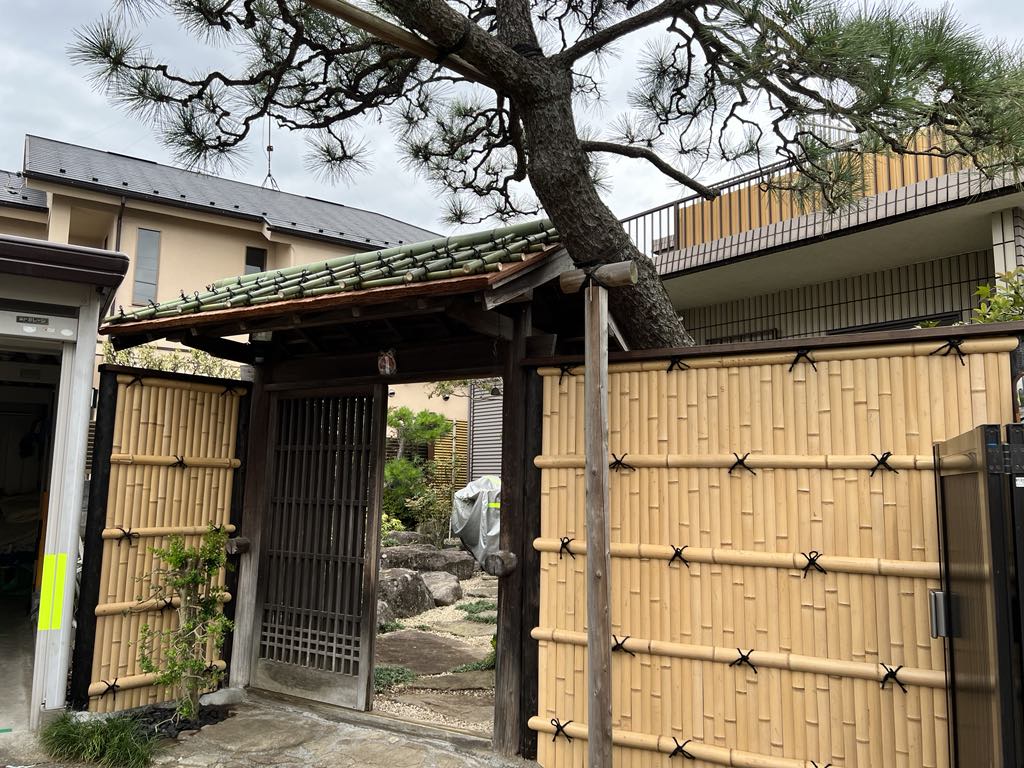 飾り門の屋根葺き替えと竹垣の工事のお願いをするに当たり、老朽化が進み数年前から工事依頼先を探しておりましたが関東近県では、なかなか見つかりませんでした。三十年あまり経った竹垣も朽ちるだけかと諦めかけていましたが、それでもと考え遠方である京都を含めて探しました。関東と離れ、まして京都の名門の長岡銘竹様に個人の小規模工事など頼める訳などないと思いながらも、ご連絡をいたしました。