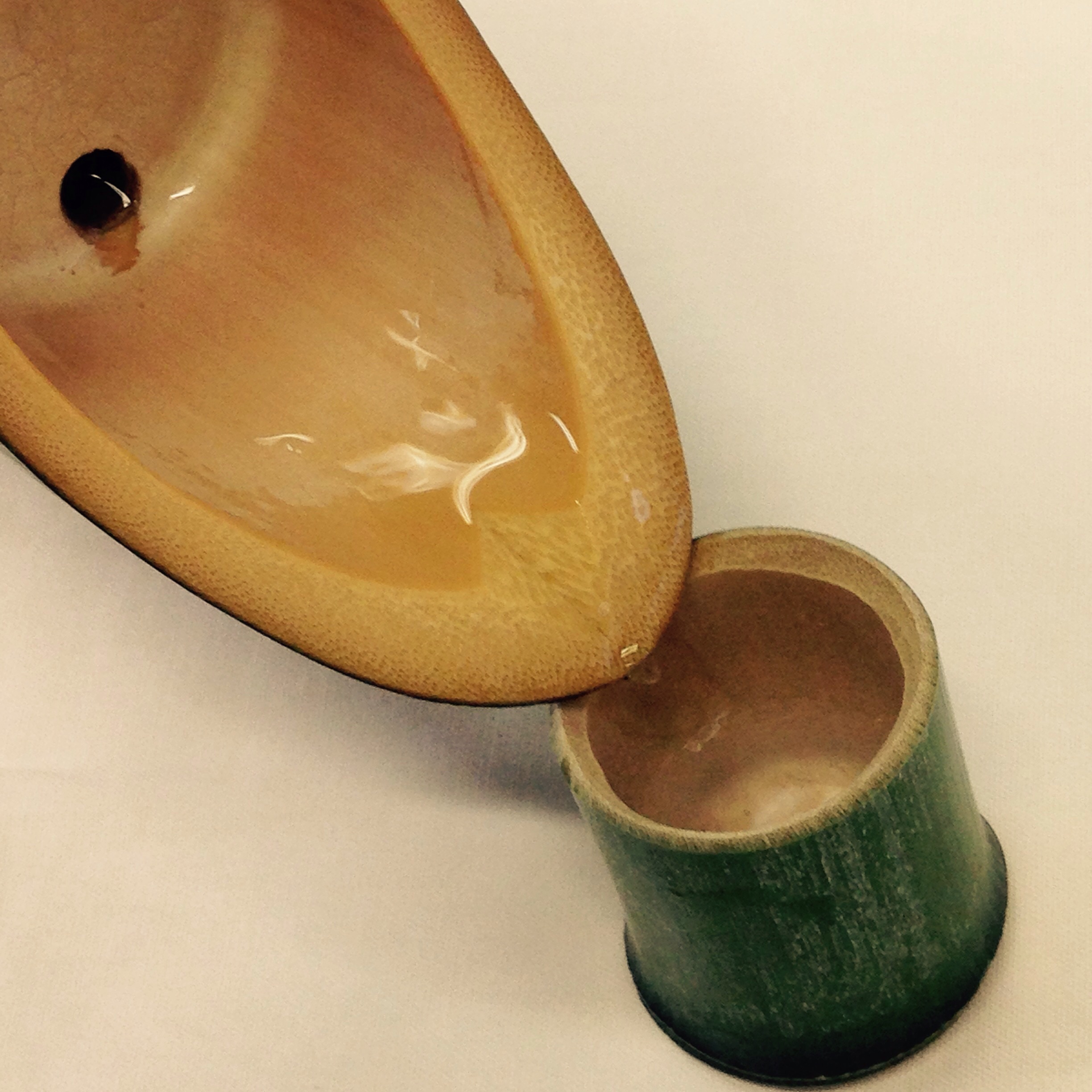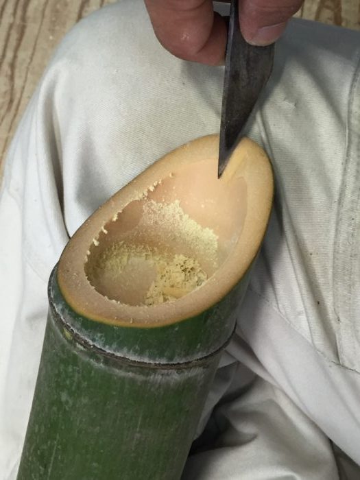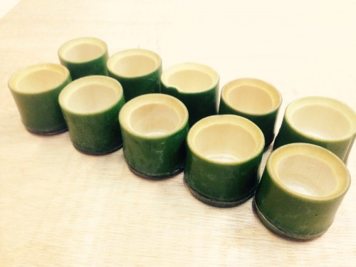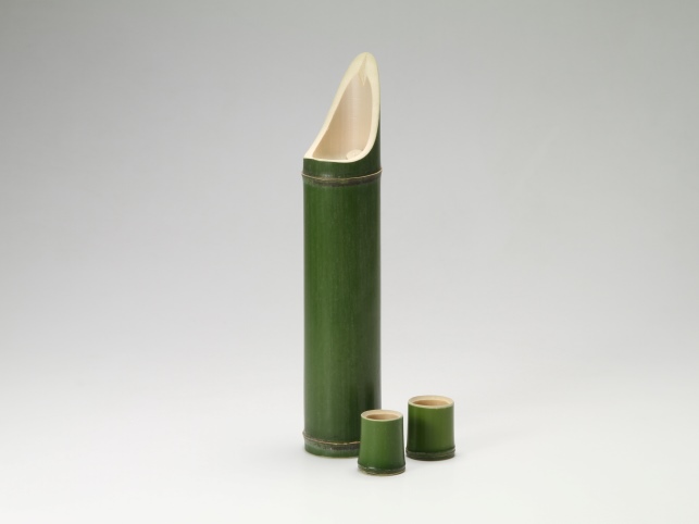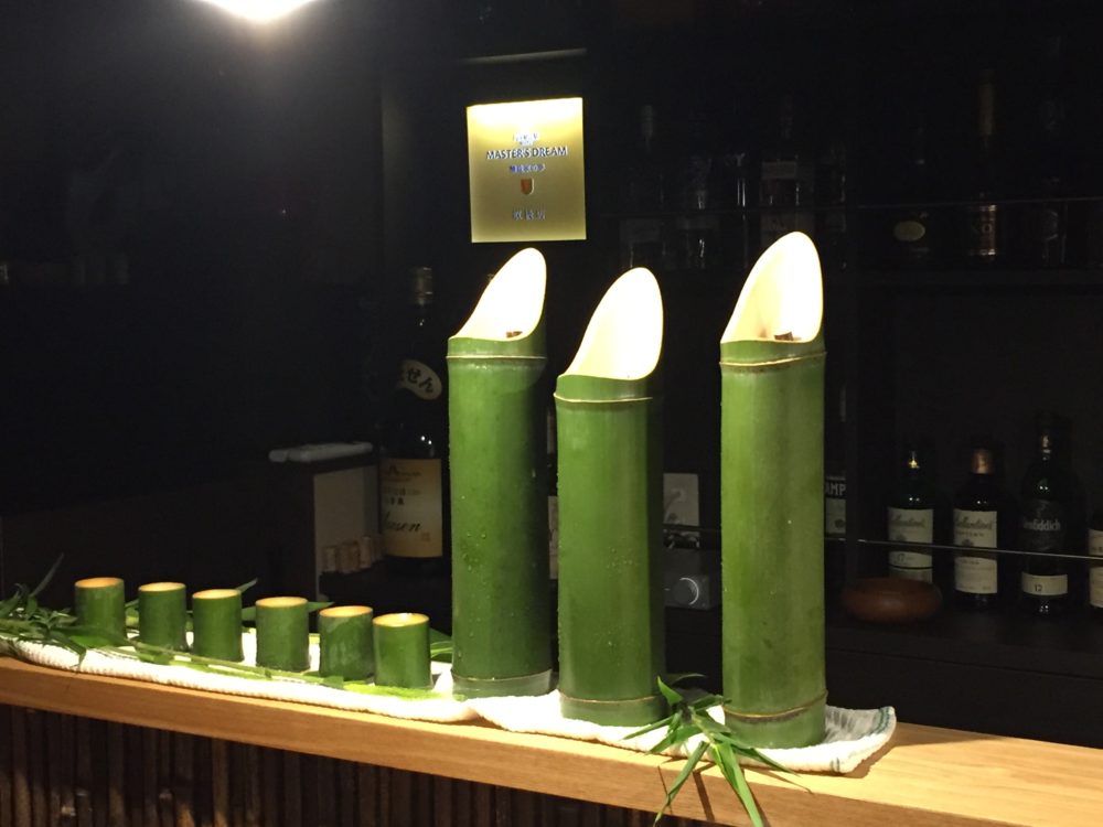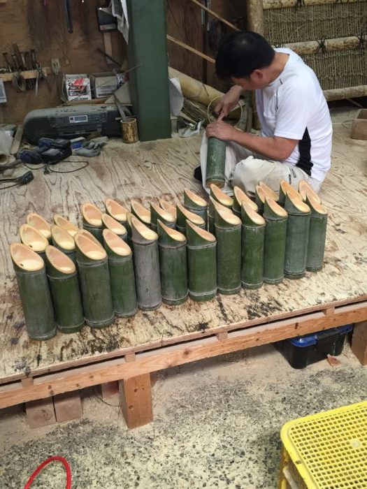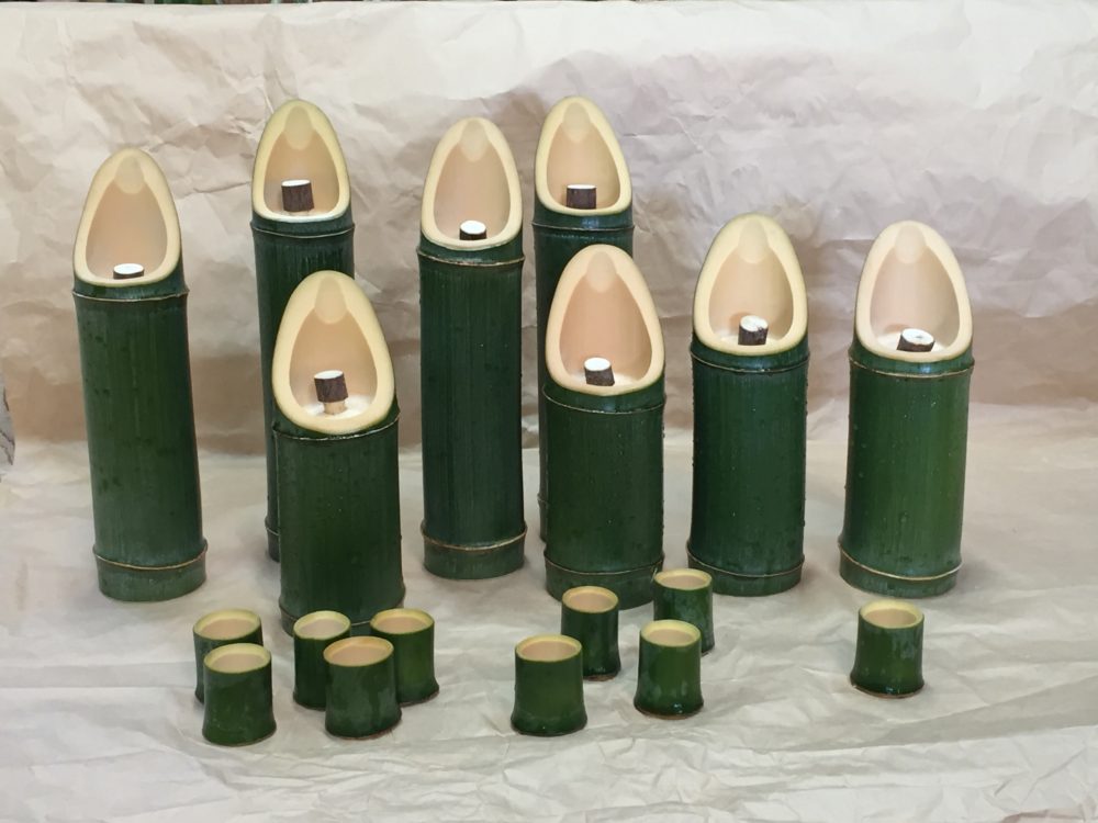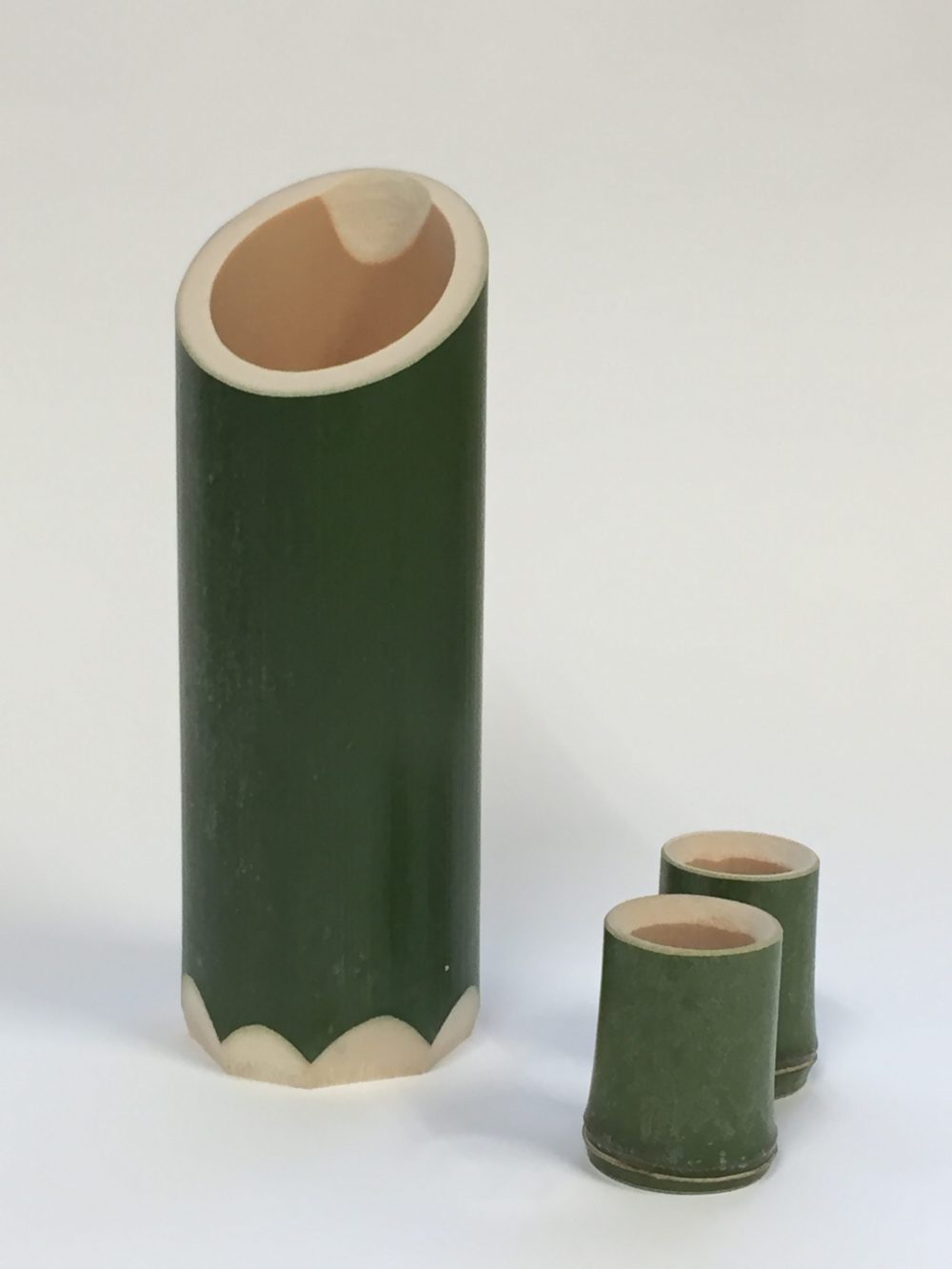京都西山の孟宗竹を使用し、職人が一つ一つ丁寧に作り上げた青竹の徳利(とっくり)と御猪口(おちょこ)は京都のみならずさまざまな地域の有名老舗料亭で使用されています。