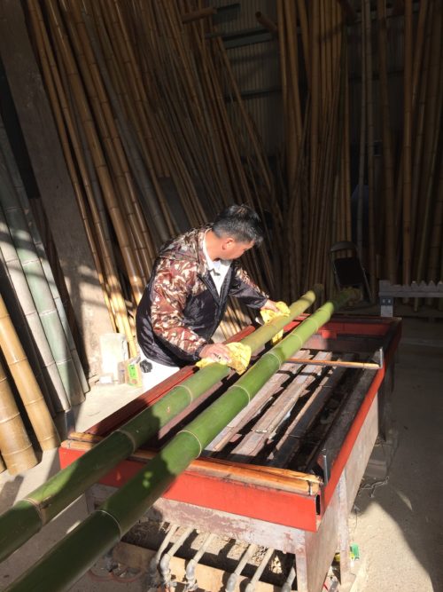 9月~12月に伐竹された竹を、火あぶりにより油を抜き天日で何日も干して、完全に乾燥させます。油抜きの作業の中で、丁寧に油を拭くことで、美しい光沢を発するようになる。