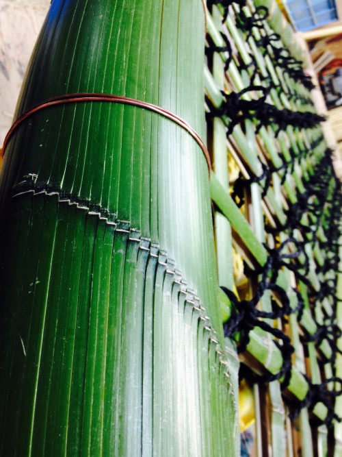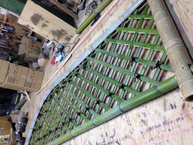 3、竹を約1寸(約3cm)に割り、裏を削ります。竹を並べて、菱を編んで縄を掛けます。