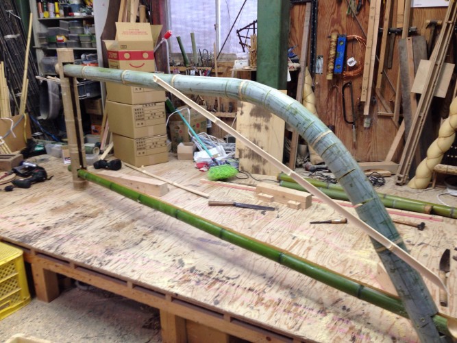 2、柱と先ほど曲げた竹に穴を開け、“受け”を差し込み、枠を組みます。