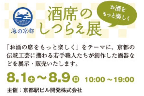 京都駅ビル2階にあります京都茶寮さんでは、明日8月1日(土)〜9日(日)まで、「お酒の席をもっと楽しく」をテーマに、京都の伝統工芸に携わる若手職人たちが創作した酒器などを展示・販売いたします。