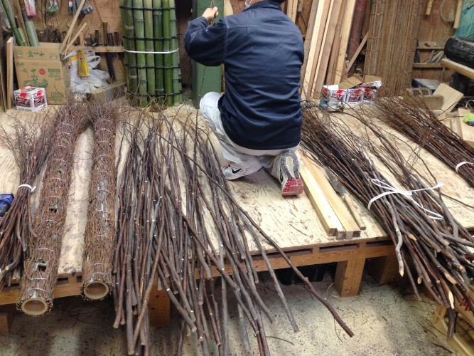 その後、柱になる竹に黒文字の穂を下巻きしていきます。(写真左側)