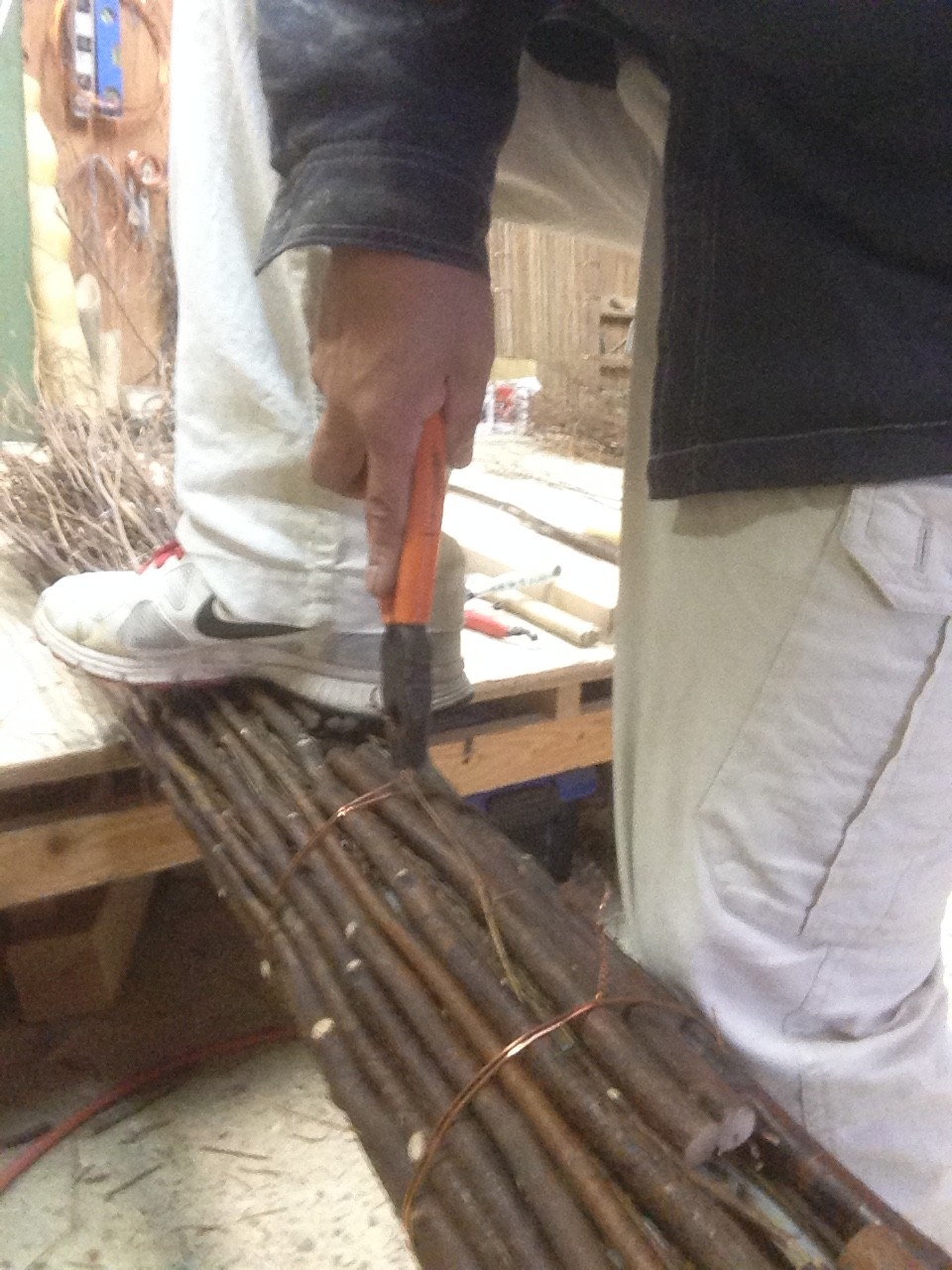 2、下巻きした柱に、真っ直ぐに矯正した黒文字を巻きつけ、銅線で固定します。