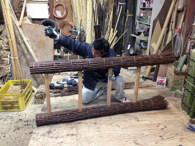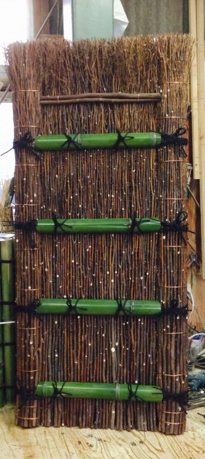 6、青竹で“押さえ”をし、上部の穂を切り揃えると黒文字垣(袖垣)の完成です。