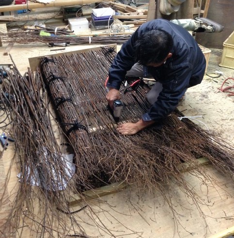 4、本体部分にも、黒文字の枝を貼っていきます。間には、黒文字の穂を敷きつめ、両面貼ります。
