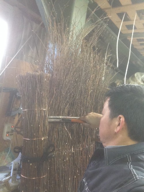 1、黒文字の枝を一本一本はさみで切り、まがった枝を火であぶりながら矯正し、真っ直ぐな黒文字の枝をつくります。(写真中央)
