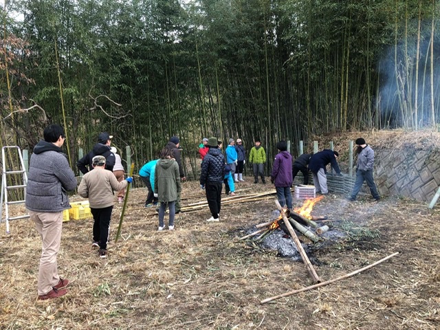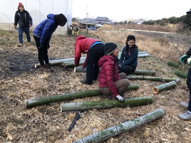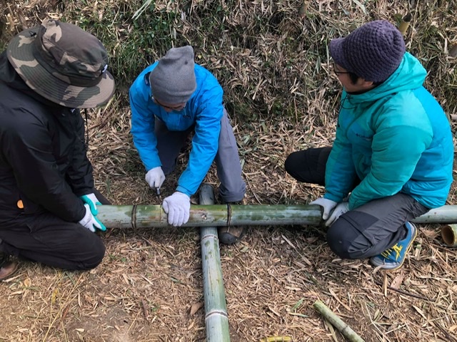 午前は“竹を割って竹垣作りに挑戦”、