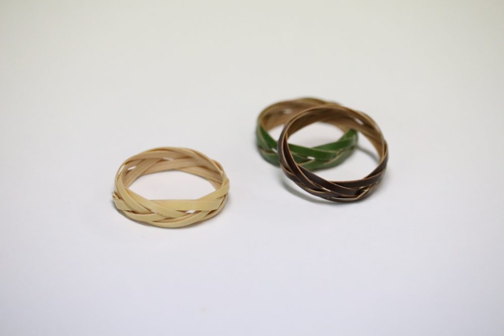 京都産の竹を使用して作った竹の指輪は、 かつて日本の一般家庭で広く使われていた桶や酒をつくるための酒樽 を固定するために使われる「タガ」。今でこそ金属製のものが多く見られますが、かつては竹で編まれたものが一般的でした。 その「タガ」の編み方をそのまま指輪にしました。 竹を丁寧に割って剥ぎ、細い竹籤(たけひご)にしてから、ひとつひとつ指輪に編んでいます。 天然素材ならではの優しいつけ心地をお楽しみください。