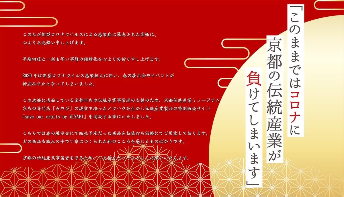 新型コロナウイルス感染症の影響を受けた京都の伝統産業事業者が集う伝統産業製品の特別販売サイト「save our crafts by MIYABI」ですが、特別販売サイトは8月末日に終了致します。
